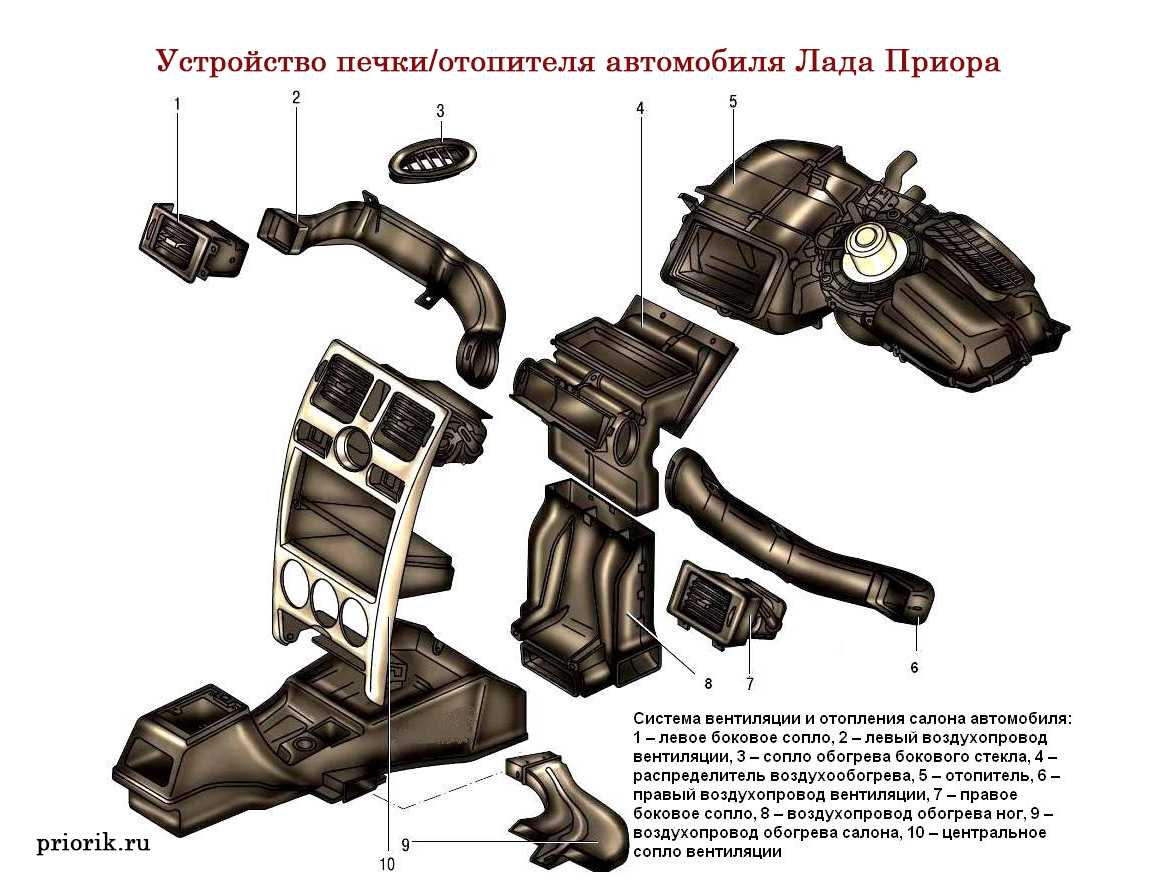 Схема устройства печки ВАЗ 2110 выглядит следующим образом: