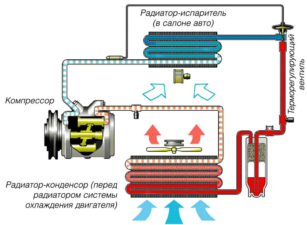 После завершения цикла хладагент поступает обратно в компрессор через трубку низкого давления, начиная цикл заново. Регулировка степени охлаждения и интенсивности обдува также возлагается на водителя.