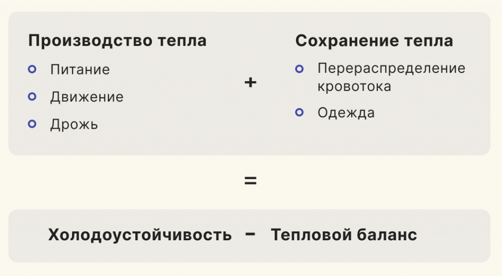 Холод бросает вызов организму по трём основным причинам — температура, ветер и влажность. В зависимости от суровости холода различаются потери тепла. Тело за счёт увеличения производства энергии и активации механизмов удержания тепла.
