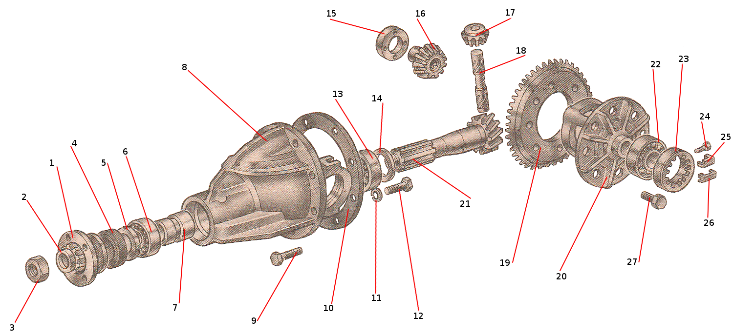 1. Фланец ведущей шестерни. 2. Плоская шайба. 3. Гайка крепления фланца ведущей шестерни. 4. Сальник. 5. Маслоотражатель. 6. Передний подшипник. 7. Распорная втулка. 8. Картер редуктора. 9. Болт крепления редуктора к балке заднего моста. 10. Прокладка. 11. Пружинная шайба. 12. Болт крепления крышки. 13. Задний подшипник. 14. Регулировочное кольцо ведущей шестерни. 15. Опорная шайба шестерни полуоси. 16. Шестерня полуоси. 17. Сателлит. 18. Ось сателлита. 19. Ведомая шестерня. 20. Коробка дифференциала. 21. Ведущая шестерня. 22. Подшипник коробки дифференциала. 23. Регулировочная гайка. 24. Болт крепления стопорной пластины. 25. Стопорная пластина. 26. Стопорная пластина. 27. Болт крепления ведомой шестерни к коробке дифференциала.