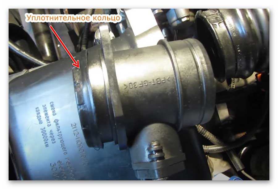 Если это кольцо (на фото оно зеленое, но у вас цвет может быть другим) сползло или вовсе осталось в корпусе фильтра, то на сеточке расходника можно будет обнаружить слой пыли. Такого дефекта хватает для выхода из строя чувствительного элемента. Собирать агрегат нужно по следующей схеме: проверить надежность фиксации уплотнительной юбки, надеть резиновое кольцо, поместить датчик в корпус воздушного фильтра.
