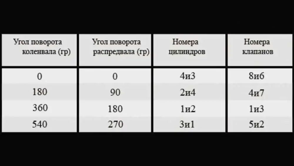 Таблица углов поворота коленвала и ВМТ поршней различных цилиндров, где 0 — совпадение меток на распредвале и верхней мертвой точке поршня 4-го цилиндра. В таком положение регулируются 8-й и 6-й клапан, после чего нужно провернуть коленвал на 180 градусов (распредвал совершит оборот на 90), тогда можно отрегулировать следующую пару.