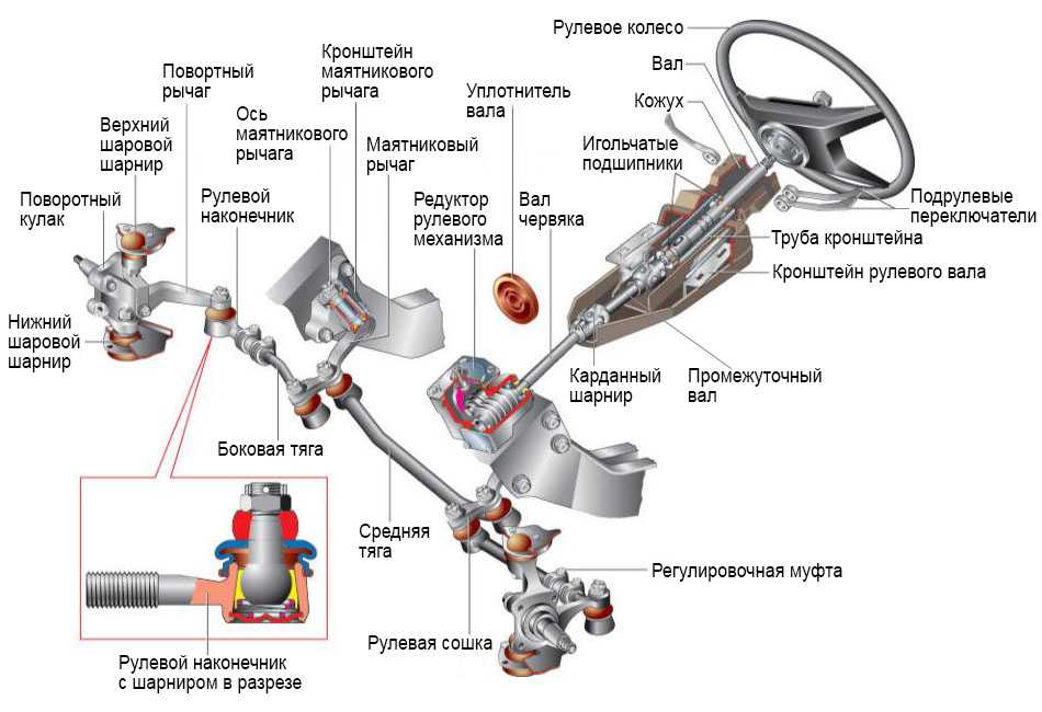 Каждая тяга имеет на своих концах шарниры (опоры), которые обеспечивают свободное вращение подвижных деталей рулевого привода относительно друг друга и кузова автомобиля.