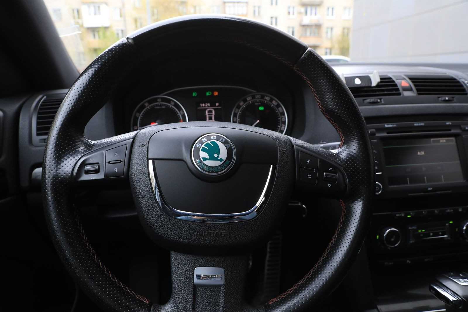 Если рассматривать интерьер заряженной модификации, то в голове сразу всплывает стандартная комплектация Skoda Octavia, но для версии RS предусмотрен полноценный черный интерьер со вставками из карбона на панели, расположенной по центру и картах дверей. Новый руль был обшит перфорированной кожей и имеет три спицы, которые прекрасно гармонируют с большими окружностями датчика скоростного режима и датчика оборотов силового агрегата, какие сами гармонично переплетаются с цветным дисплеем борткомпьютера.
