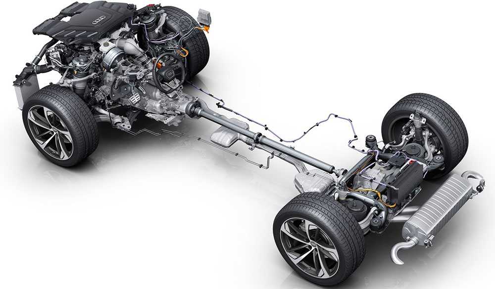 С двигателями работает 8-ступенчатый гидротрансформаторный автомат tiptronic с центральным механическим дифференциалом системы Quattro. Полный привод постоянный, а при необходимости соотношение передаваемого момента меняется.