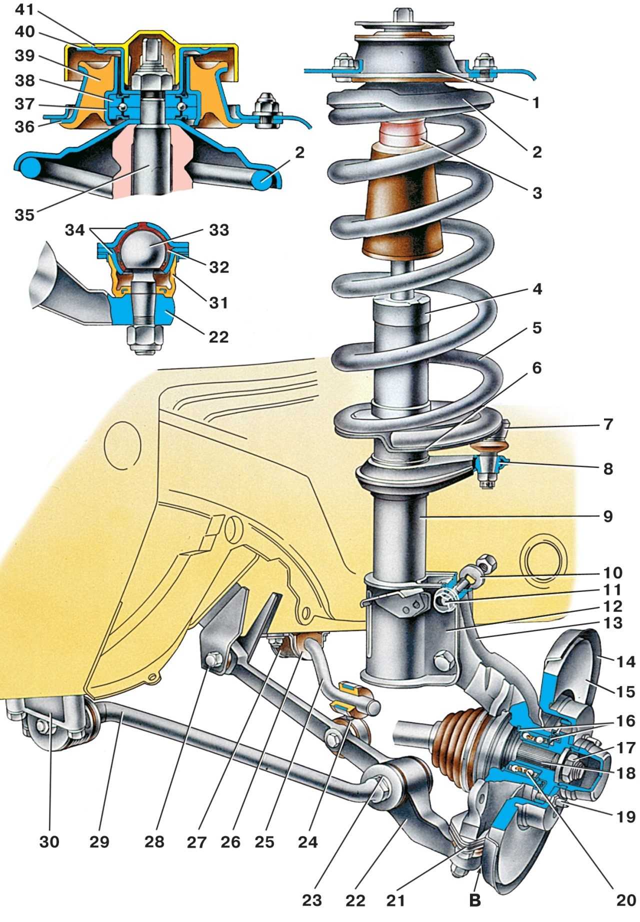 Рис. 4.1. Передняя подвеска в сборе: 1 – верхняя опора телескопической стойки; 2 – верхняя опорная чашка; 3 – буфер хода сжатия с защитным кожухом; 4 – опора буфера сжатия; 5 – пружина подвески; 6 – нижняя опорная чашка пружины; 7 – шаровой шарнир рулевой тяги; 8 – поворотный кулак; 9 – телескопическая стойка; 10 – эксцентриковая шайба; 11 – регулировочный болт; 12 – кронштейн стойки; 13 – поворотный кулак; 14 – защитный кожух переднего тормоза; 15 – диск тормозного механизма; 16 – стопорное кольцо; 17 – гайка ступицы колеса; 18 – шлицевой хвостовик корпуса шарнира привода колеса; 19 – направляющий штифт; 20 – подшипник ступицы колеса; 21 – шаровой шарнир; 22 – рычаг подвески; 23 – регулировочные шайбы; 24 – стойка стабилизатора; 25 – штанга стабилизатора; 26 – подушка штанги стабилизатора; 27 – кронштейн крепления штанги стабилизатора; 28 – кронштейн кузова для крепления рычага подвески; 29 – растяжка рычага подвески; 30 – кронштейн крепления растяжки; 31 – защитный чехол шарового пальца; 32 – подшипник шарового пальца; 33 – шаровой палец; 34 – корпус шарового пальца; 35 – шток стойки подвески; 36 – наружный корпус верхней опоры; 37 – внутренний корпус верхней опоры; 38 – подшипник верхней опоры; 39 – резиновый элемент верхней опоры; 40 – ограничитель хода верхней опоры; 41 – защитный колпак верхней опоры; В — зона для контроля шарнира подвески |