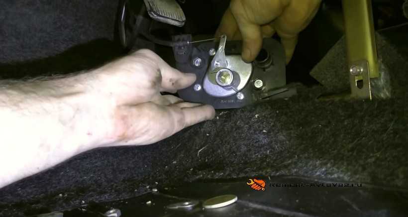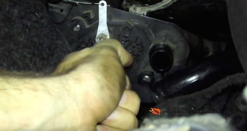 5. Спускаемся под автомобиль и с помощью торцового ключа № 10 откручиваем гайки крепления крана. Далее в салоне демонтируем пружинный фиксатор, путем отсоединения от крана троса управления, после чего сам кран просто нужно потянуть на себя за патрубок.