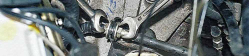 Непосредственно регулировка. Собственно, ничего особо разбирать не понадобится, все происходит из подкапотного пространства, а также из салона. Понадобятся только два обычных ключа на 13. Открываем капот, находим наконечник троса сцепления, контргайку на нем. Одним из ключей ослабляем эту контргайку. Вторым таким же ключом поворачиваем регулировочную гайку. «Накатывая» ее на наконечник, мы увеличиваем полный ход педали, откручивая от нее подальше – уменьшаем.